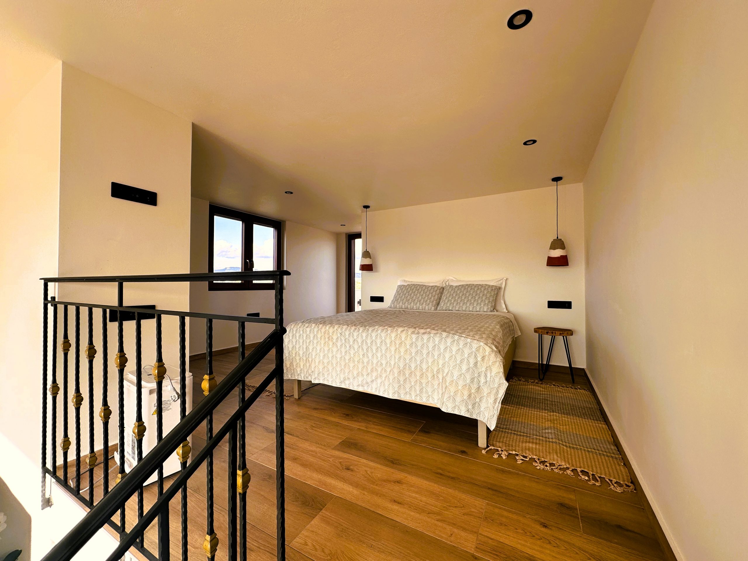 The house is arranged over two levels, offering comfort and privacy. The first floor includes a living room, kitchen, and bathroom, opening onto a spacious balcony where guests can enjoy open views and beautiful sunsets over the Cretan landscape. Upstairs, the bedroom and a second bathroom create a calm and restful sleeping space.