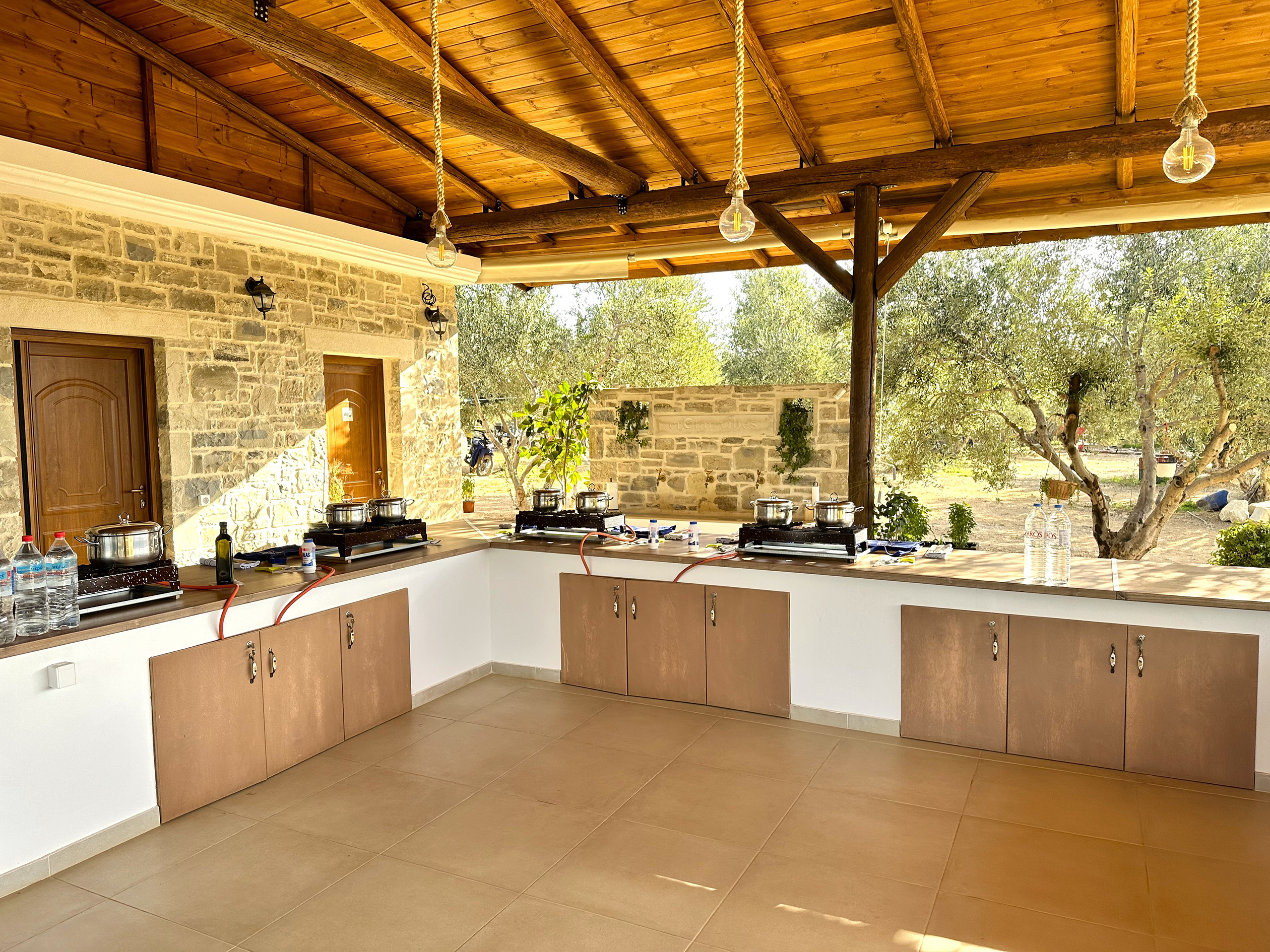 The whole experience unfolds in an outdoor space beneath a beautiful wooden roof, surrounded by olive trees on one side and a lush garden on the other. Engage your senses—smell, taste, and feel our culture through a one-of-a-kind cooking adventure. This is not a tourist show — it is an invitation into our home, our kitchen, and our way of life.